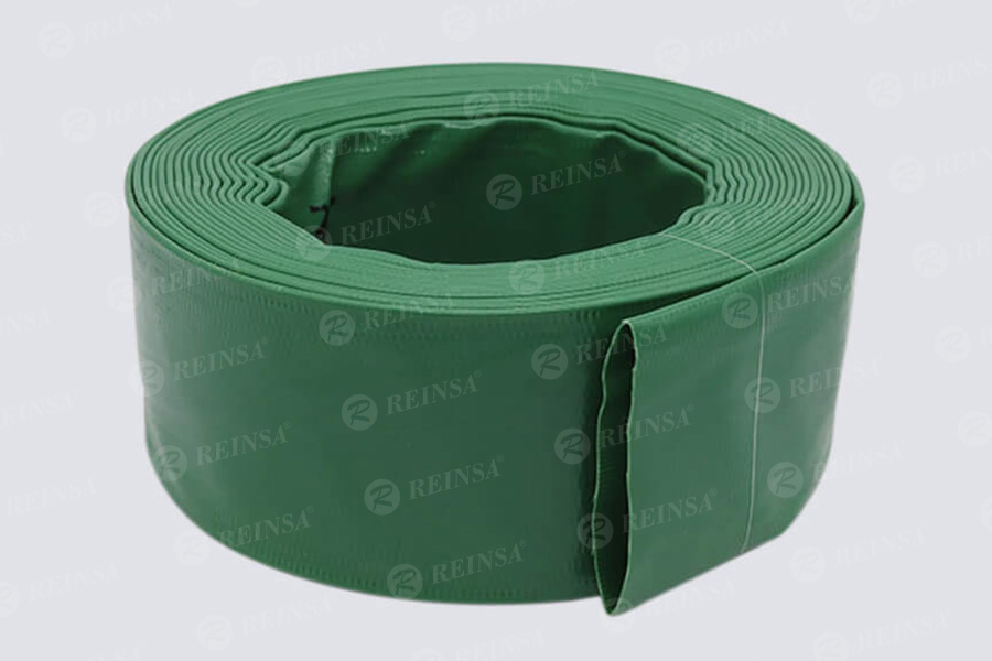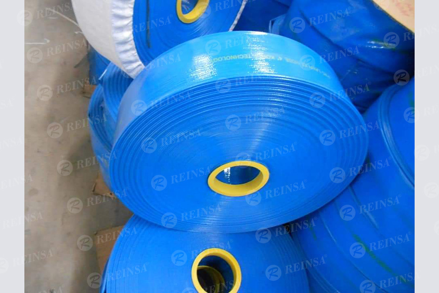 Manguera plana flexible azul de PVC reforzada con tejido de poliéster para uso general.